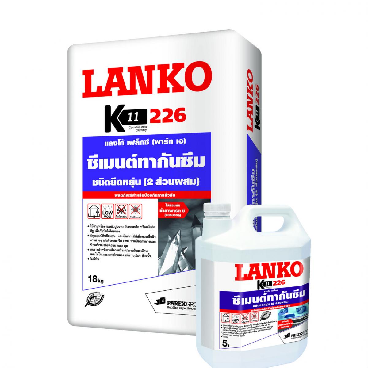 แลงโก้ 226 (LANKO 226 K11 FLEX) ประกอบด้วยส่วนประกอบ 2 ส่วน คือ ปูนผสมพิเศษ และเรซิ่น ผสมส่วนผสมทั้ง 2 ส่วน เข้าด้วยกัน ใช้ทาหรือฉาบบนผิวคอนกรีตหรือปูนฉาบเพื่อป้องกันหรือแก้ปัญหาการรั่วซึมของโครงสร้าง เมื่อแห้งจะมีความทึบน้ำ และมีความยืดหยุ่นในตัวเอง จึงไม่เกิดปัญหา การแตกร้าวเหมาะกับงานโครงสร้างที่มีการสั่นสะเทือน หรือเสี่ยงต่อการแตกร้าว เช่น รอยต่อระหว่างผนังกับพื้น นอกจากนั้นยังเหมาะสำหรับ ห้องน้ำ ระเบียง โดยใช้ทาก่อนการปูกระเบื้อง ไม่มีพิษ สามารถใช้กับถังเก็บน้ำได้