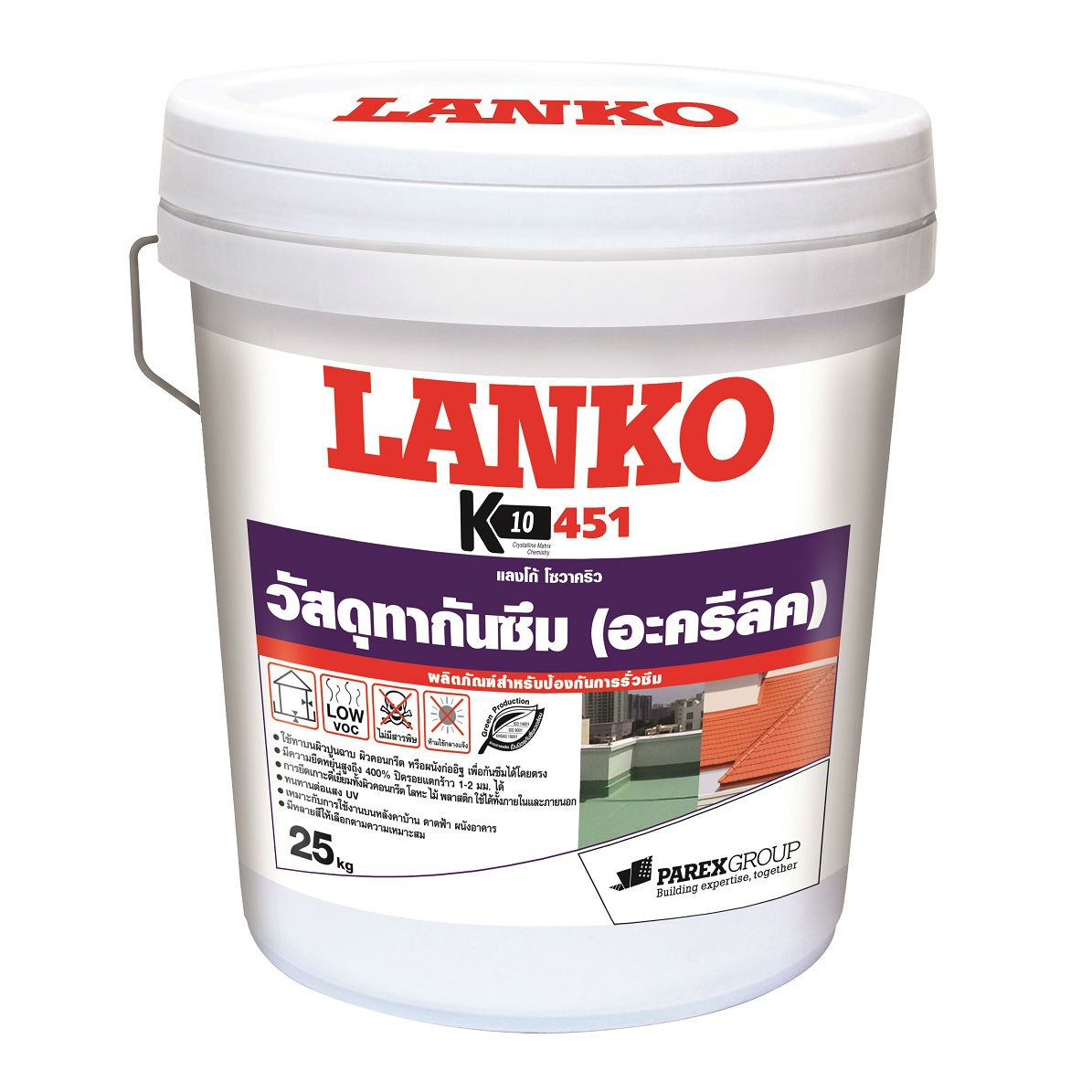 LANKO 451 K10 Sovacry เป็นวัสดุทากันซึมประเภท อะคริลิค สำหรับผนัง หลังคาและดาดฟ้า หลังากแห้งจะมีลักษณะคล้ายแผ่นยาง ซึ่งสามารถป้องกันการซึมผ่านของน้ำ มีความยืดหยุ่น จึงไม่เกิดปัญหาเมื่อโครงสร้างมีการยืดหรือหดตัว LANKO 451 K10 Sovacry ใช้ทำเป็นระบบ 5 ชั้น เสริมความแข็งแรงด้วย ตาข่ายไฟเบอร์เสริมแรง สำหรับงานดาดฟ้า หรือ หลังคาคอนกรีตที่ต้องการระบบกันซึมที่มีความทนทานเป็นพิเศษทา LANKO 451 K10 Sovacry เพียง 2 ชั้น สามารถอุดรูพรุนบนพื้นผิว เพื่อป้องกันการรั่วซึมและปกป้องพื้นผิวจากมลภาวะ ทำให้โครงสร้างมีอายุการใช้งานที่ยาวนานขึ้น
